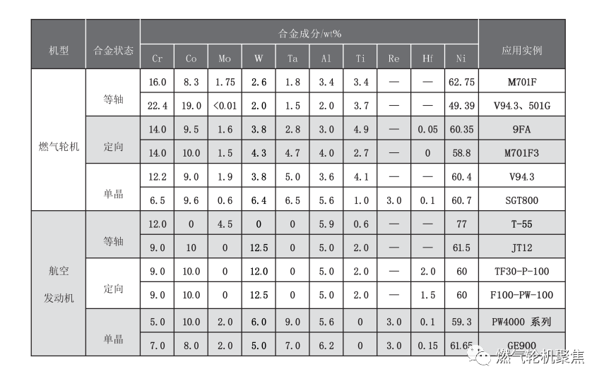 高溫合金在航空發動機和燃氣輪機渦輪葉片中的應用如下圖所示,二者所用高溫合金成分基本類似。